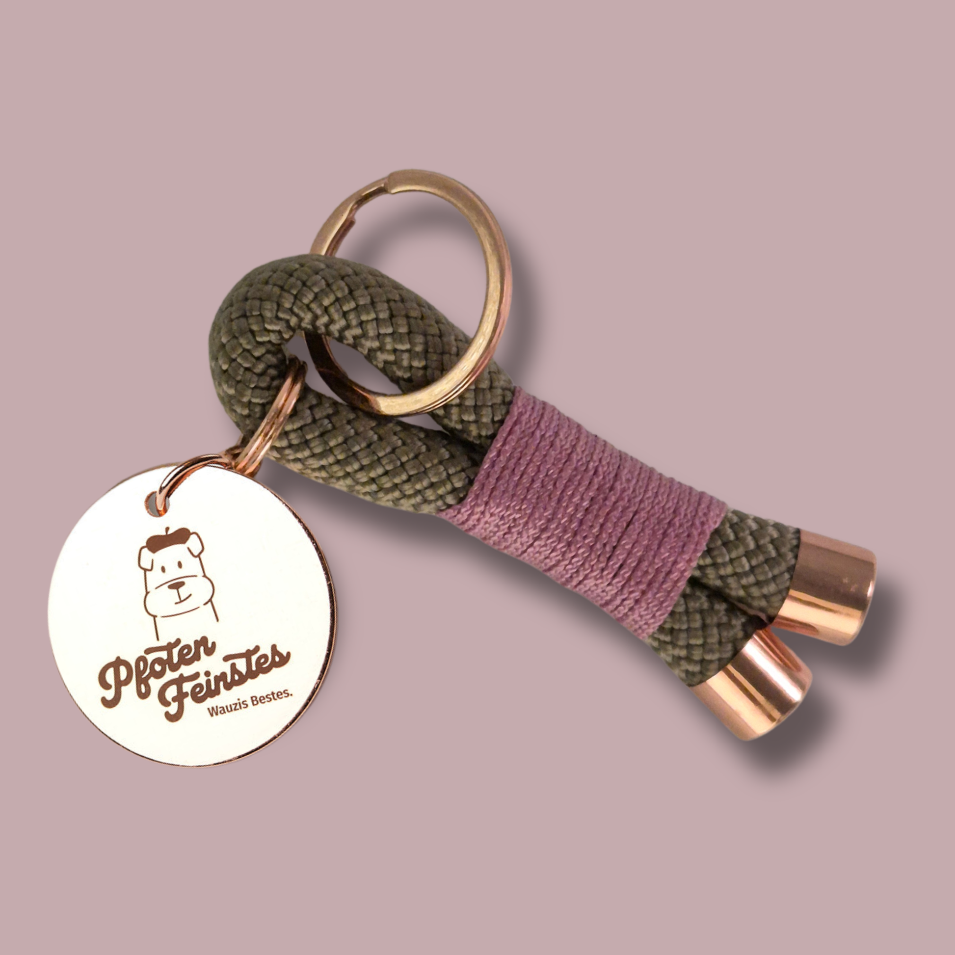 Der Schlüsselanhänger Roséglanz ist die perfekte Ergänzung zu unserer Premium Hundeleine Roséglanz und überzeugt mit einem eleganten Design aus TAN-Haupttau, feinem Lavender/Rosa-Cord und hochwertigen roségoldenen Beschlägen.