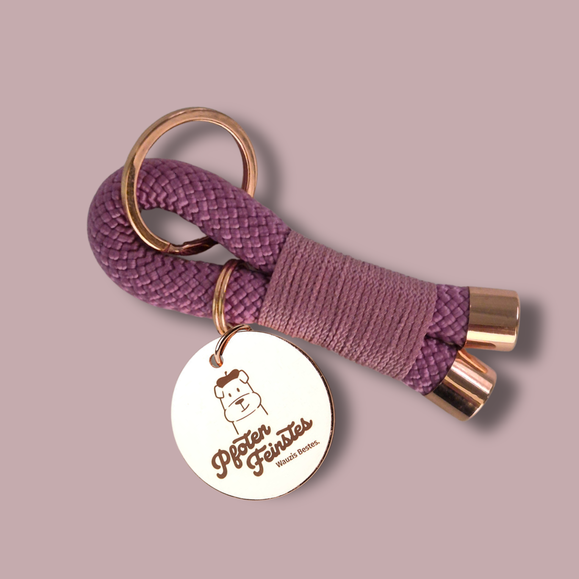 Der Schlüsselanhänger wird aus hochwertigem PPM-Tau (Polypropylen-Multifilament), feinem Cord und roségoldenen Metallbeschlägen gefertigt. Das Material ist langlebig, wasserabweisend und pflegeleicht.