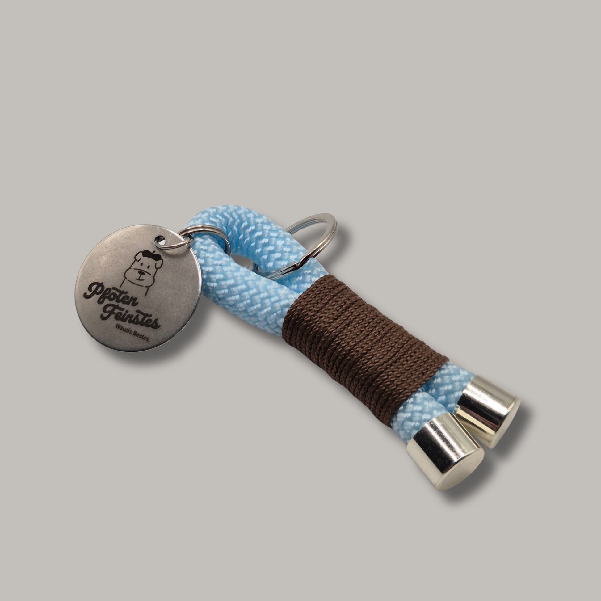 Das frische Blau erinnert an klare Himmelstage, während das erdige Braun Ruhe und Wärme ausstrahlt. Silberne Details setzen einen modernen, dezenten Akzent und verbinden beide Farbtöne harmonisch. Ob als hochwertiger Schlüsselanhänger für Haus- oder Autoschlüssel oder als perfekt abgestimmtes Accessoire zur Hundeleine – dieses Modell vereint Leichtigkeit, Stil und Alltagstauglichkeit.