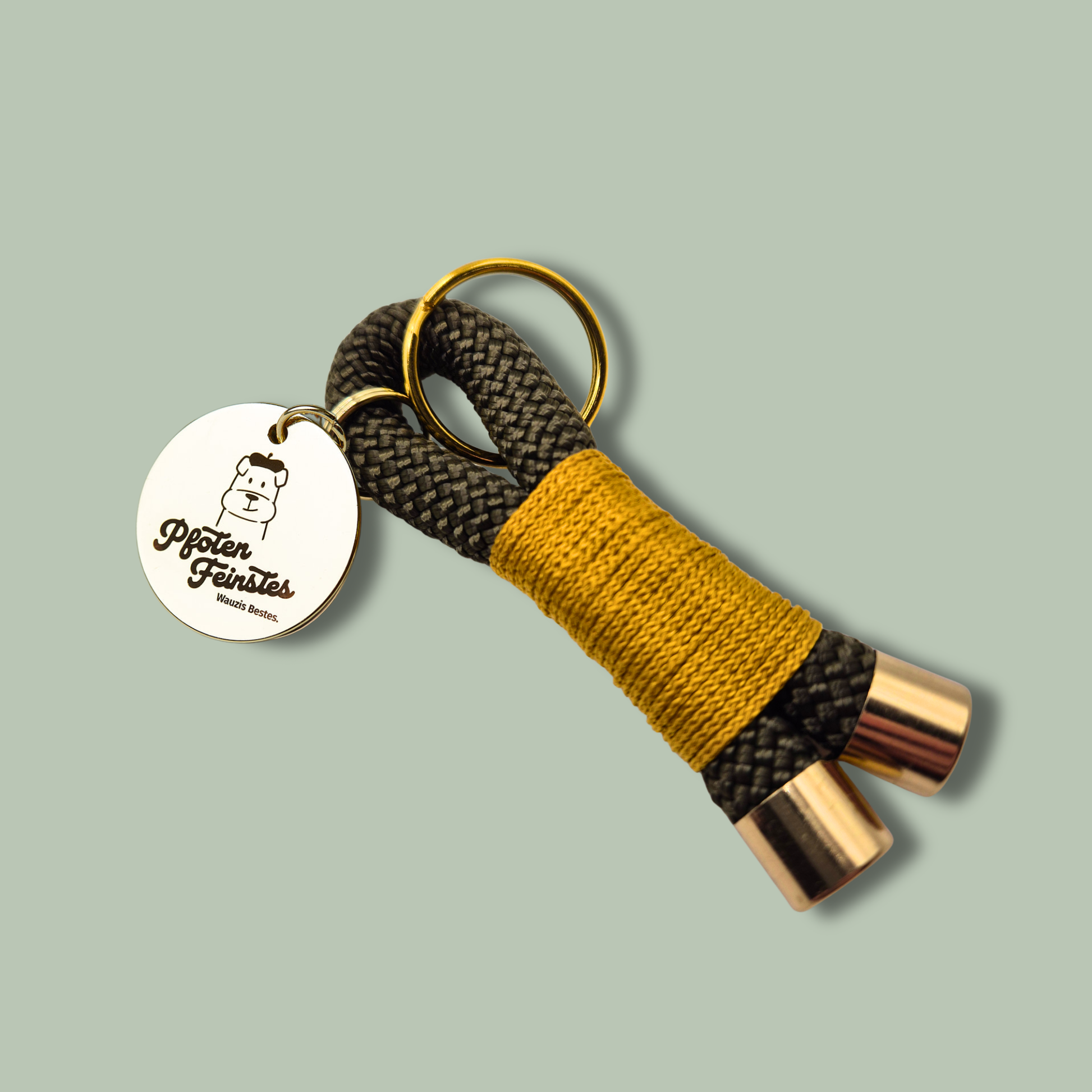 Der Schlüsselanhänger Jägerglanz ist die perfekte Ergänzung zur Premium Hundeleine Jägerglanz. Sattes Army Grün trifft auf warm schimmerndes Gold-Rush-Cord und hochwertige goldene Beschläge – eine kraftvolle Farbkombination mit natürlicher Ausstrahlung.