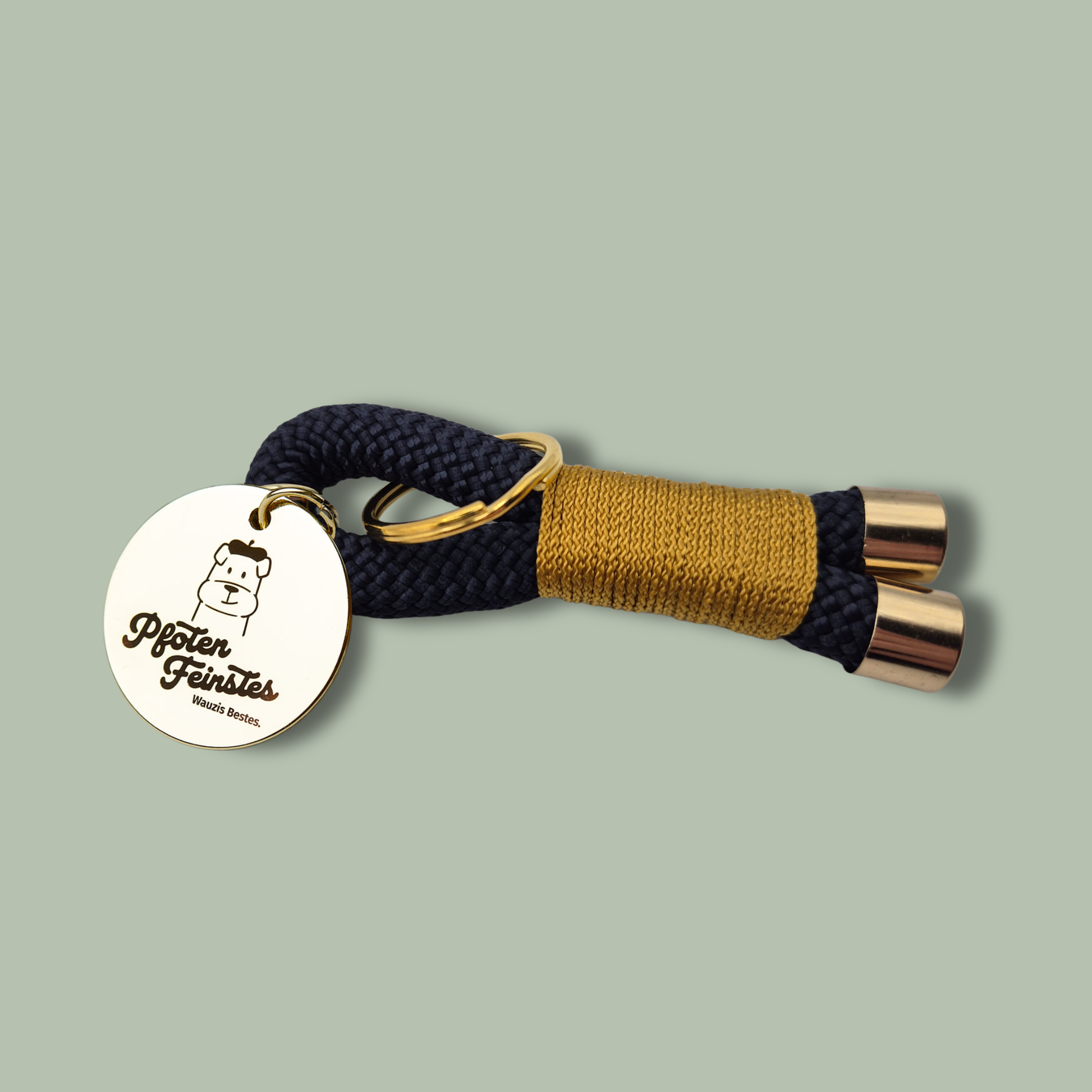 Der Schlüsselanhänger wird aus hochwertigem PPM-Tau (Polypropylen-Multifilament) in Deep Sea Blue gefertigt und mit robusten goldenen Metallbeschlägen verarbeitet. Das Material ist langlebig, wasserabweisend und pflegeleicht.