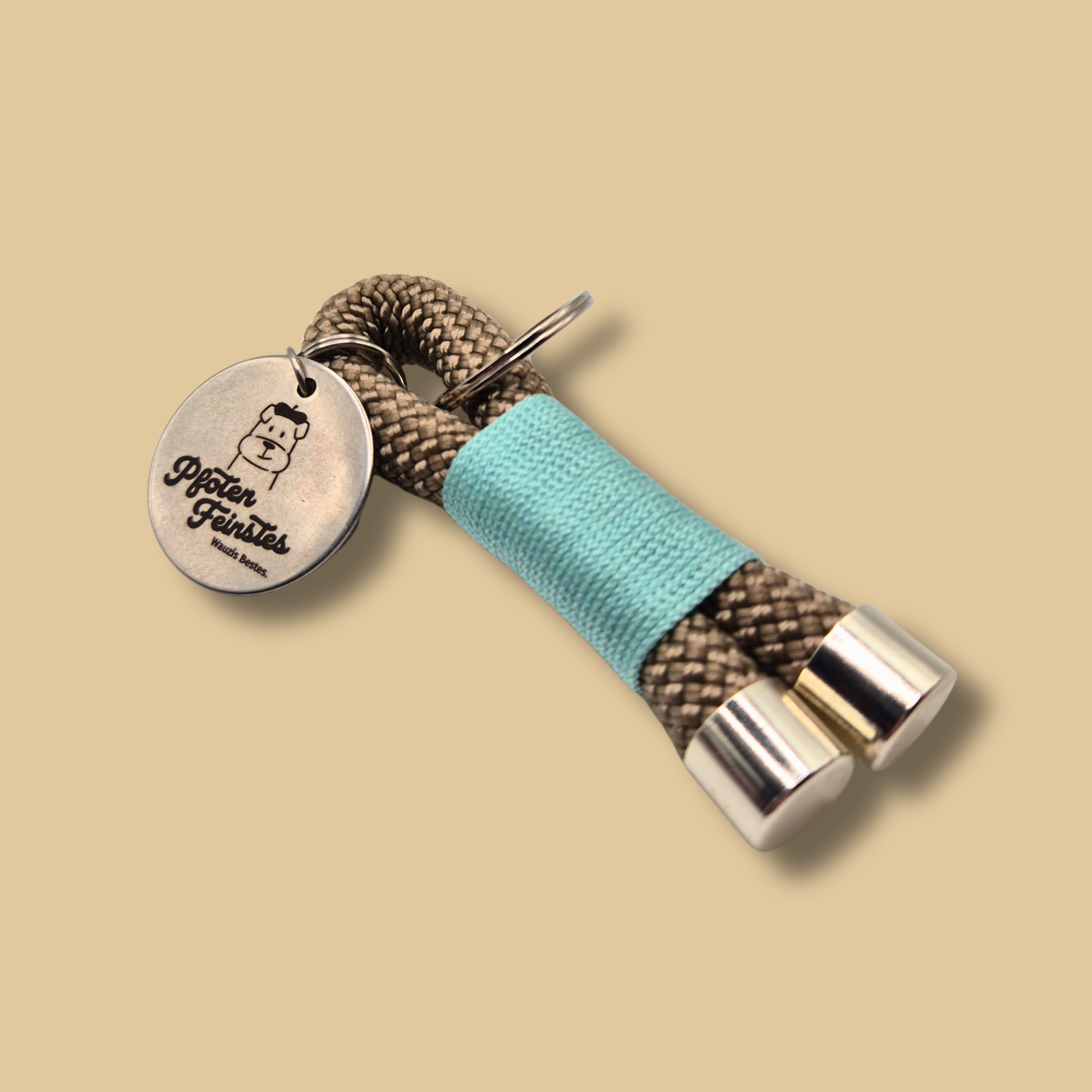 Der Schlüsselanhänger wird aus hochwertigem PPM-Tau (Polypropylen-Multifilament) in TAN gefertigt und mit Mint-/Blau-Cord sowie stabilen silbernen Metallbeschlägen verarbeitet. Das Material ist langlebig, wasserabweisend und pflegeleicht.